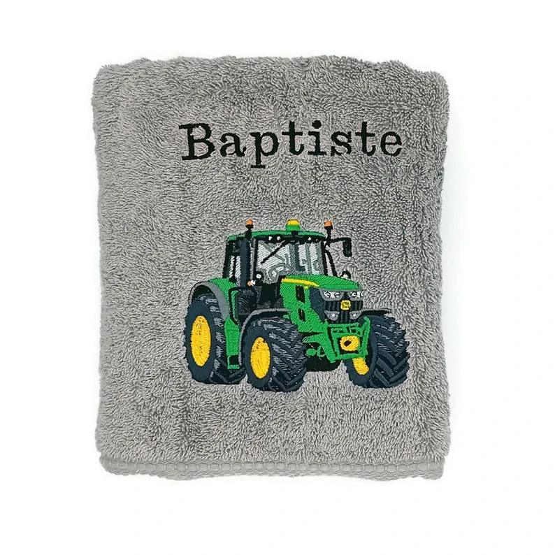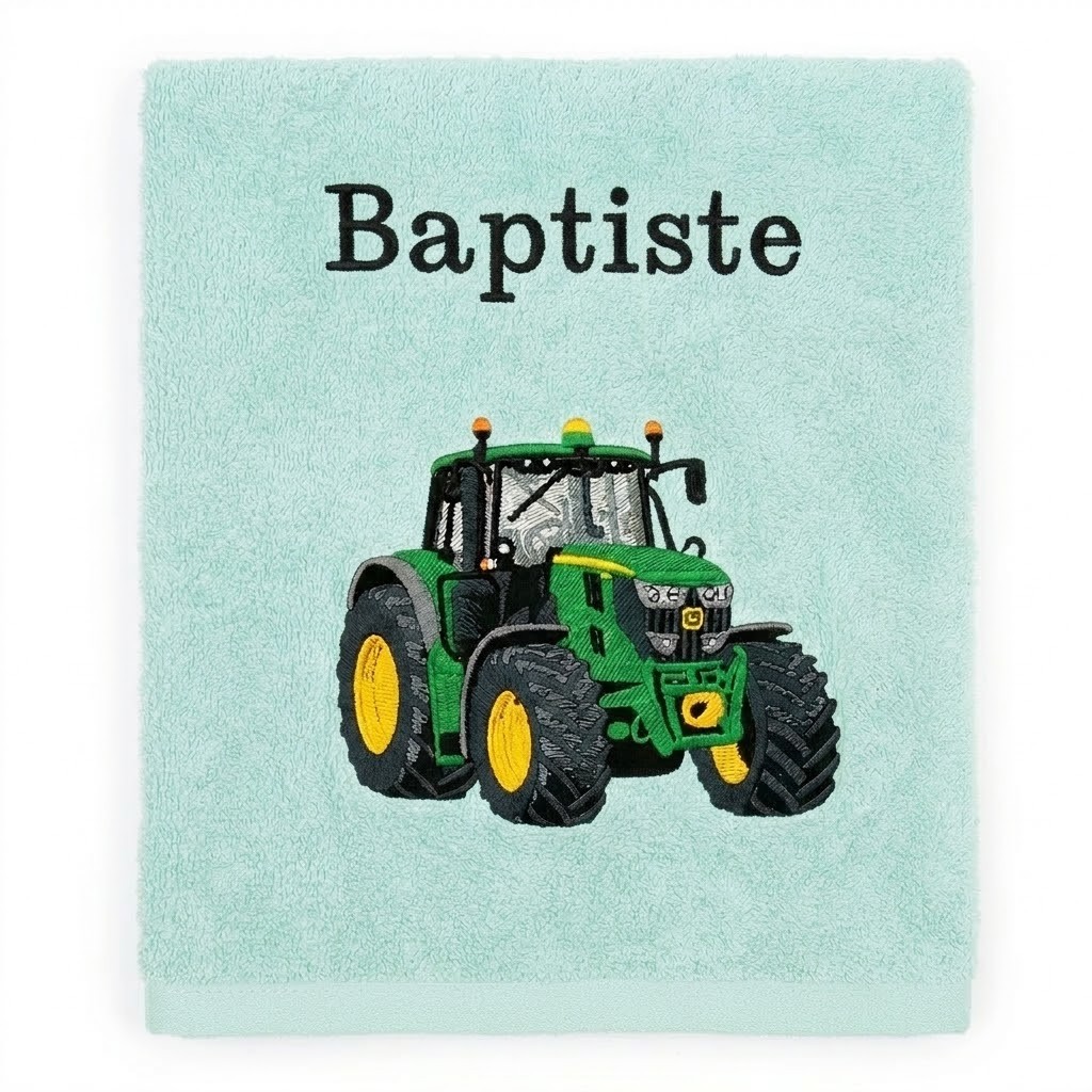 Réalisée dans notre atelier avec soin et précision, cette serviette est ornée d’une broderie colorée représentant un beau tracteur vert et jaune, symbole de la vie à la ferme, du travail et de la nature.