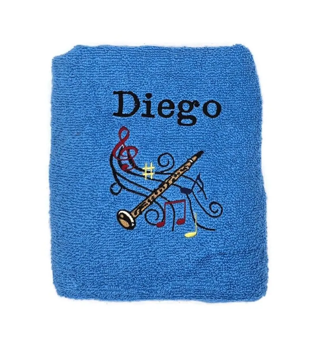 Originale, colorée et pleine de rythme, cette serviette personnalisée met en valeur un superbe motif musical brodé avec précision. Entre clé de sol, notes colorées et clarinette élégante, elle apporte une touche artistique et vibrante à un accessoire du quotidien.