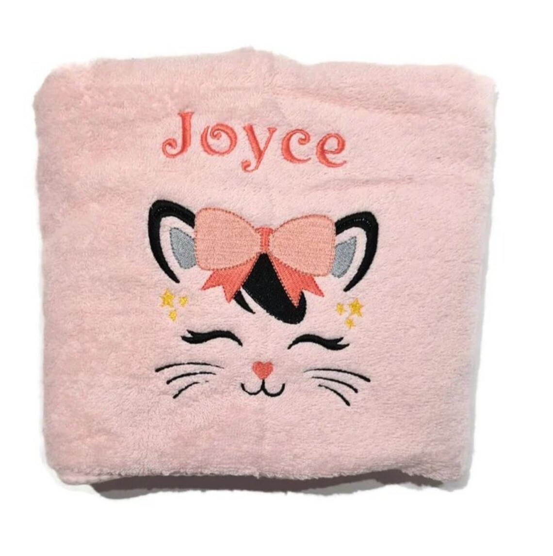Craquante, tendre et pleine de charme, cette serviette personnalisée met en valeur un adorable visage de chat brodé avec finesse. Avec son grand nœud coloré, ses petites étoiles et son expression toute douce, elle apporte une touche joyeuse et féminine à un accessoire du quotidien.