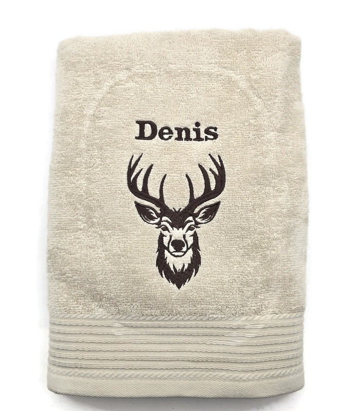 Personnalisation Classique : La serviette est fièrement ornée du prénom de votre choix (ex: Denis) brodé en fil brun foncé assorti au-dessus du cerf, pour une touche personnelle et distinctive.