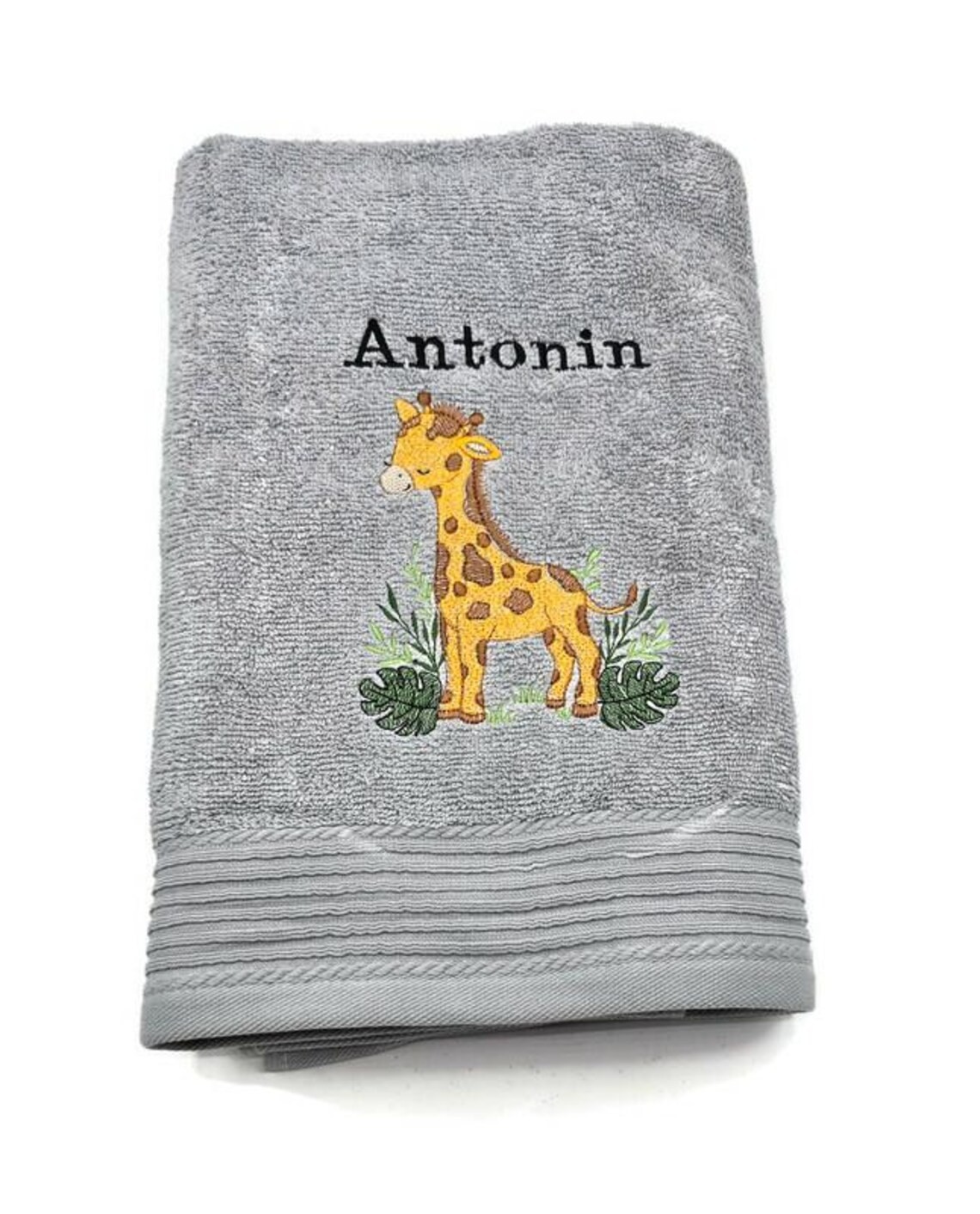 Envolez-vous vers les plaines ensoleillées avec notre serviette "Girafe de la Savane". Ce modèle, dans un gris chiné intemporel et élégant, met en scène une adorable petite girafe aux yeux clos, paisiblement entourée de feuilles tropicales et de monstera. Une pièce pleine de tendresse qui fera du séchage un moment de pur câlin.