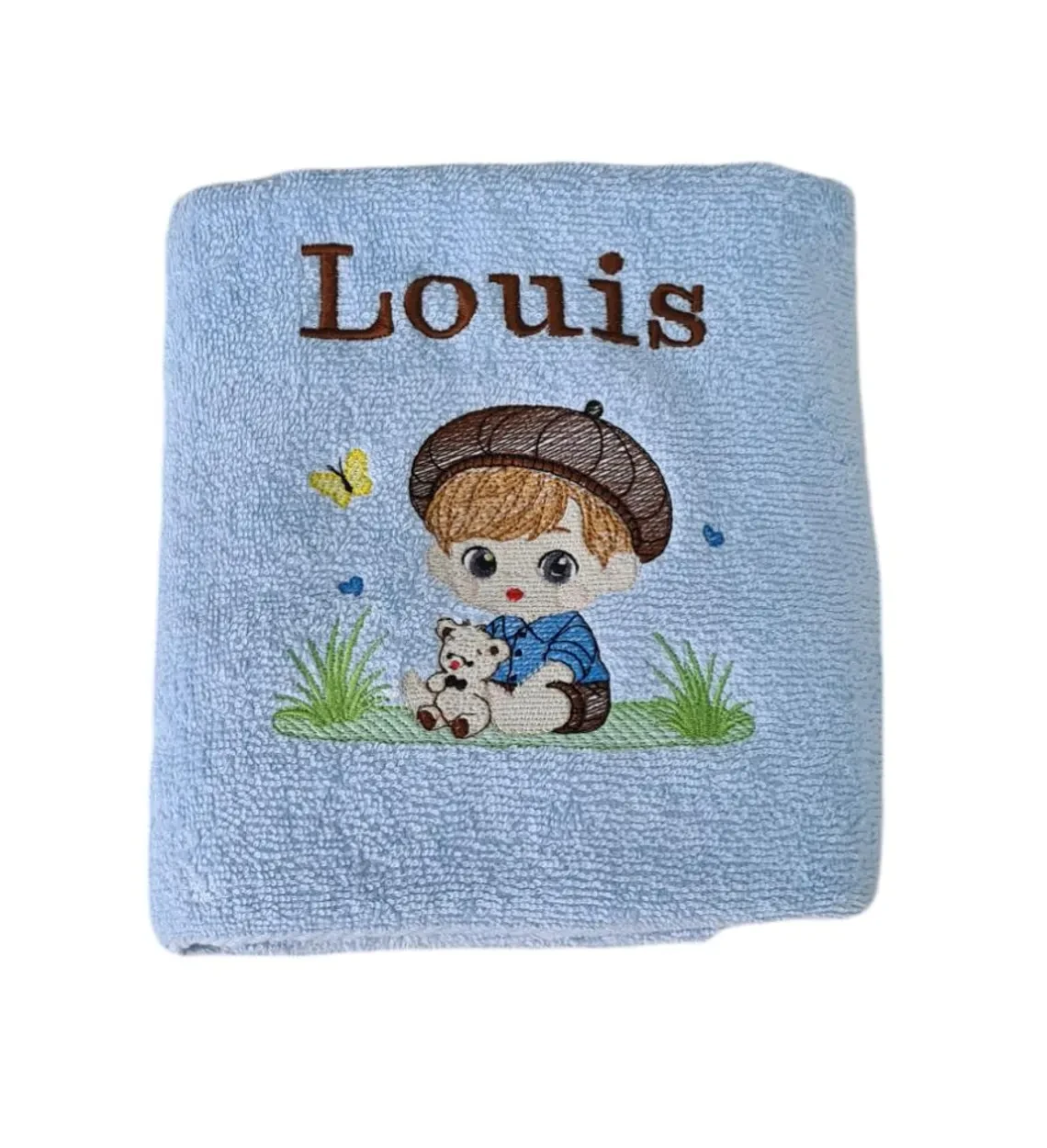 Plongez dans un univers empreint de nostalgie et de tendresse avec notre serviette "Garçon au berret". Sur un fond bleu ciel apaisant, ce modèle dévoile une broderie fine d'un petit garçon élégant avec son béret, tenant tendrement son ours en peluche. Une scène bucolique complétée par un papillon jaune virevoltant, parfaite pour envelopper vos enfants de douceur après le bain.