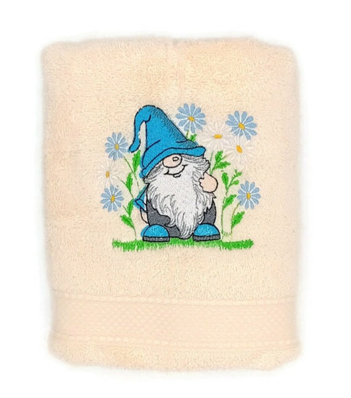 Laissez-vous transporter dans un conte de fées avec notre serviette "Gnome des bleu". Ce petit gardien du jardin, avec son chapeau pointu bleu et sa barbe soyeuse, semble tout droit sorti d'un sous-bois enchanté. Entouré de marguerites délicates, il apporte une note de gaieté et de sérénité à chaque moment de soin.