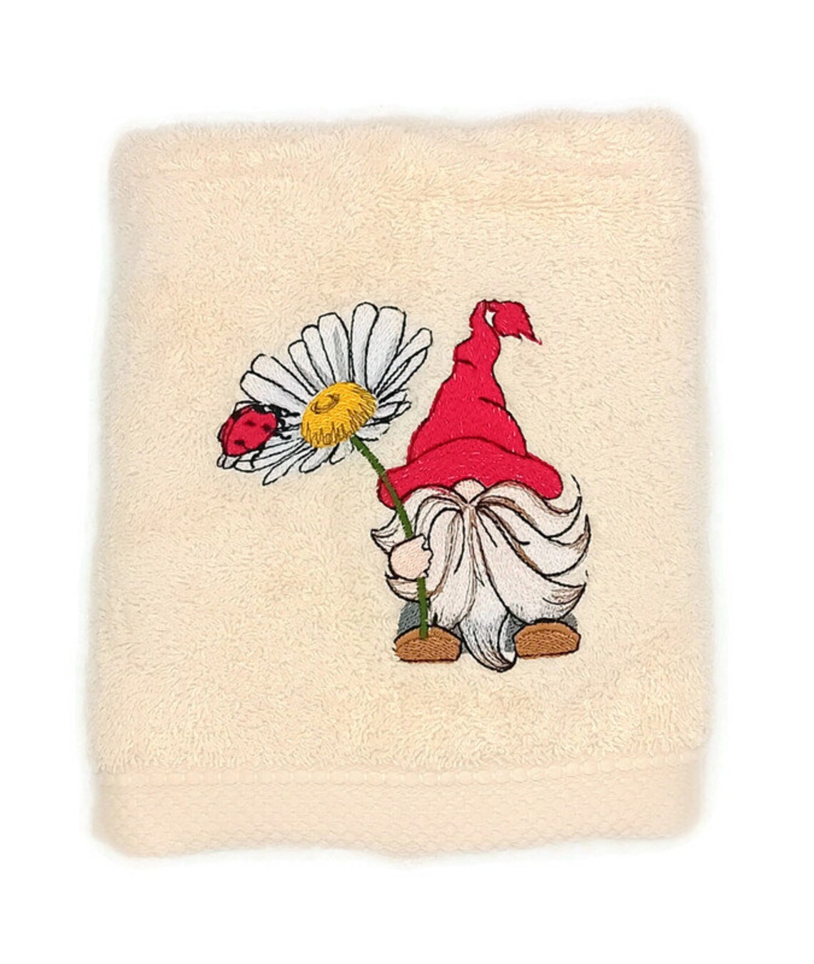 Apportez une touche de chance et de poésie à votre salle de bain avec notre serviette "Gnome à la Coccinelle". Ce petit habitant légendaire des jardins, avec son bonnet rouge éclatant et sa barbe généreuse, vous offre une marguerite fraîchement cueillie. Un motif tendre et printanier qui ravira les petits comme les grands.