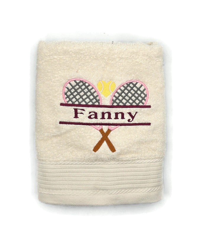 Une serviette élégante et sportive, parfaite pour les passionnés de tennis. Le motif brodé représente deux raquettes croisées aux contours rose tendre, accompagnées d’une balle jaune éclatante. Le prénom brodé au centre apporte une touche unique et personnalisée, idéale pour offrir ou se faire plaisir.