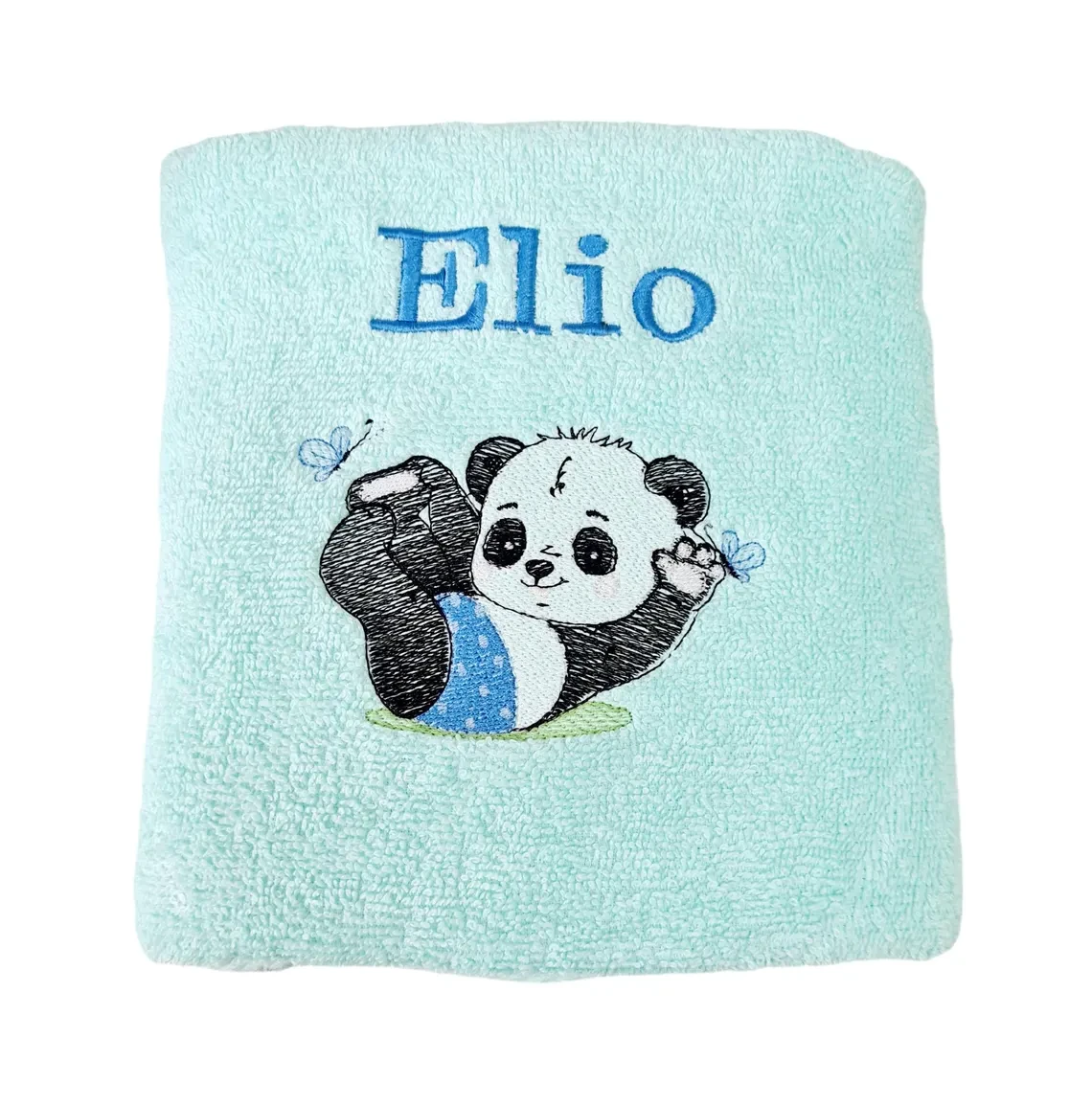 Une serviette turquoise clair pleine de douceur et de malice. La broderie représente un petit panda allongé sur le dos, vêtu d’un short bleu à pois blancs, jouant avec deux papillons bleus qui virevoltent autour de lui. Au‑dessus du motif, le prénom “Elio” est brodé en fil bleu, dans une typographie simple et élégante.