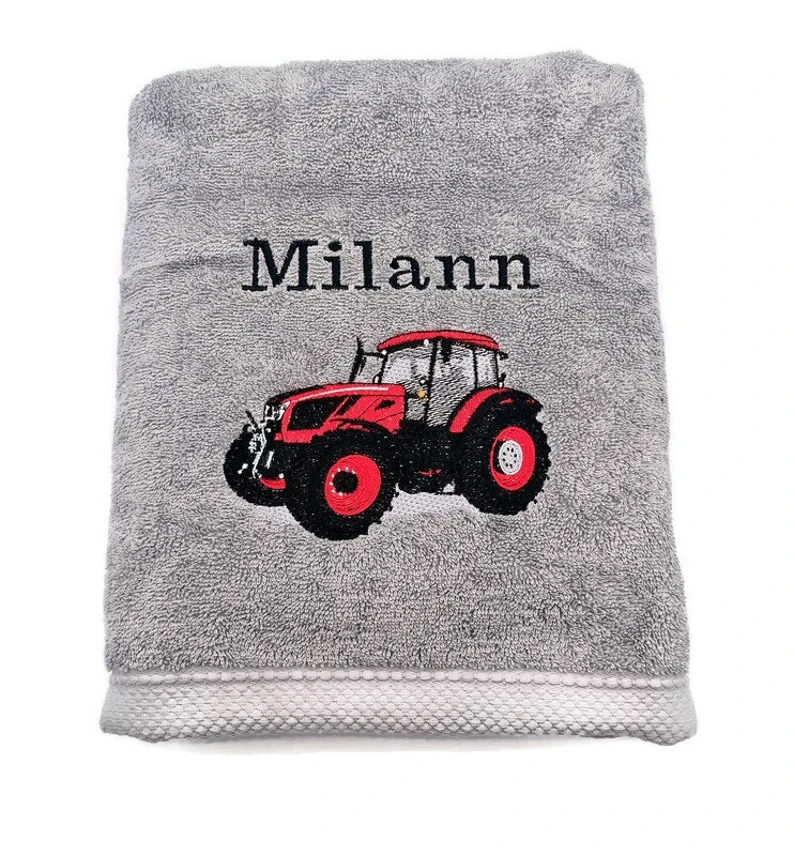 Une serviette gris clair au style robuste et plein de caractère. La broderie représente un tracteur rouge aux détails noirs et blancs, soigneusement réalisé pour un rendu net et dynamique. Au‑dessus du motif, le prénom “Milann” est brodé en fil noir, dans une typographie lisible et moderne.