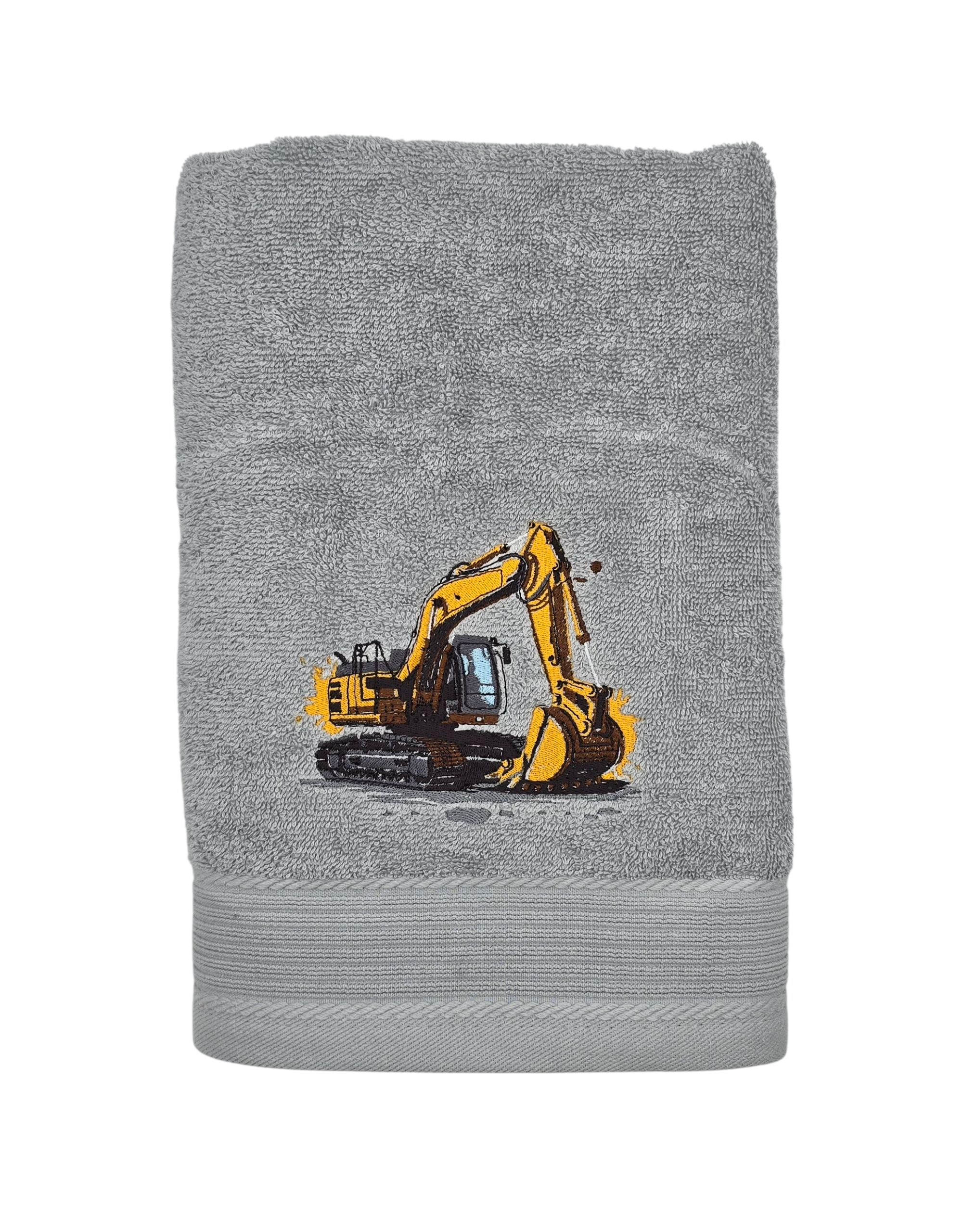 Une serviette gris clair au look robuste et ludique, parfaite pour les petits fans de chantiers et de machines. La broderie représente une pelleteuse jaune détaillée, avec son bras articulé, son godet et ses chenilles, pour un rendu réaliste et dynamique. Le contraste entre le jaune vif et le gris de la serviette crée un visuel moderne et accrocheur.