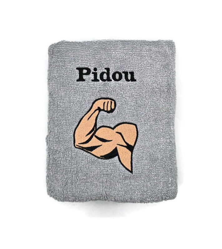 Une serviette gris clair au style fun, moderne et affirmé. La broderie représente un bras musclé stylisé, réalisé en fil beige et noir pour un rendu contrasté et dynamique. Au‑dessus du motif, le prénom “Pidou” est brodé en fil noir, dans une typographie simple, nette et expressive.