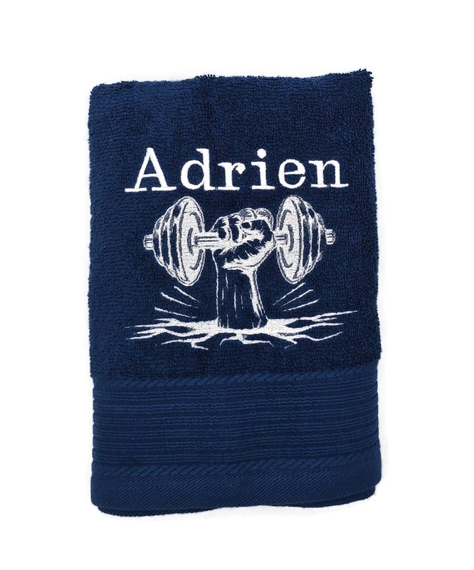 Une serviette bleu marine au style puissant et dynamique, parfaite pour les amateurs de sport et de musculation. La broderie représente un bras musclé tenant un haltère, surgissant d’un effet de fissure stylisé pour un rendu percutant et moderne. Au‑dessus du motif, le prénom “Adrien” est brodé en fil blanc, offrant un contraste net et élégant.